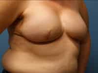 This patient developed left breast cancer. She underwent double mastectomies through breast reduction-type incisions (Wise Pattern) to remove excess skin and allow better reshaping of the breasts. Dr. Geiger placed tissue expanders under the muscle and supported them with her own excess breast skin (inferior autoderm technique). She completed the expansion phase and subsequently underwent exchange to smooth round silicone implants for an excellent outcome giving her both a reduction and a breast lift.